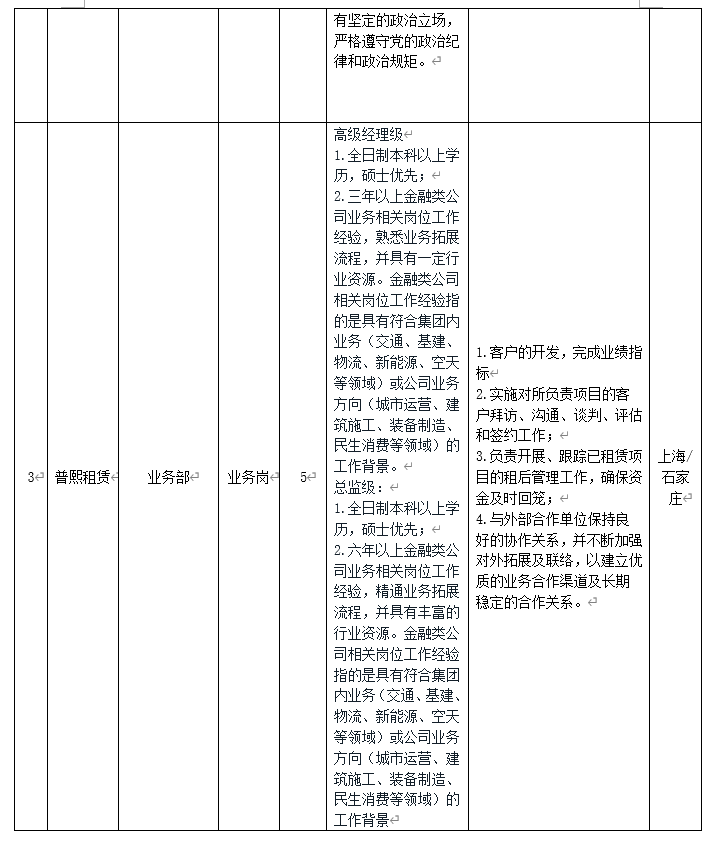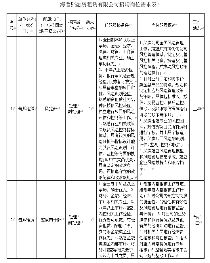 此次擬聘人數(shù)8名,詳見下表。 具體崗位職責(zé)和任職要: 德才兼?zhèn)洹⒚裰鞴_、競(jìng)爭(zhēng)擇優(yōu)、依法依規(guī)原則。 (一)具有中華人民共和國(guó)國(guó)籍,遵紀(jì)守法,品行端正。 (二)擁護(hù)中國(guó)共產(chǎn)黨的領(lǐng)導(dǎo),認(rèn)真貫徹黨的路線方針,遵紀(jì)守法,思想政治素質(zhì)好,責(zé)任心強(qiáng),具有良好的道德品質(zhì)和職業(yè)操守。 (三)身體健康,無(wú)傳染疾病,具有正常履行崗位職責(zé)的身體條件。 (四)符合親屬回避要求(與企業(yè)負(fù)責(zé)人存在近親關(guān)系的人員應(yīng)遵守回避要求,不得應(yīng)征,更不能在其一方擔(dān)任領(lǐng)導(dǎo)的機(jī)構(gòu)從事人力資源、風(fēng)險(xiǎn)管理、財(cái)務(wù)、紀(jì)檢監(jiān)察、審計(jì)工作)。 1. 受過(guò)治安、刑事處罰,強(qiáng)制戒毒或有犯罪嫌疑尚未查清的; 2. 曾被開除黨、團(tuán)籍的; 3. 受到所在單位黨紀(jì)政紀(jì)處分期限未滿的、接受組織調(diào)查的; 4. 工作期間嚴(yán)重違反所在單位規(guī)章制度的。 (一)報(bào)名方式: 1. 登錄獵聘網(wǎng)官網(wǎng)或app,搜索“上海普熙融資租賃有限公司”,找到對(duì)應(yīng)崗位直接投遞。 2. 直接將簡(jiǎn)歷發(fā)送至指定郵箱:[email protected](備注“擬報(bào)崗位+姓名+電話+來(lái)源精英融資租賃培訓(xùn)網(wǎng)”) (二)招聘程序:報(bào)名、初查甄選、面試、背景調(diào)查、體檢、結(jié)果公示、聘用入職。 (三)報(bào)名時(shí)間:2025年6月26日9:00—2024年8月31日17:30。如報(bào)名期間招錄到合適人選,具體以普熙公司在官網(wǎng)(https://www.puxizl.com)發(fā)布的公示信息為準(zhǔn)。請(qǐng)有意向的應(yīng)聘人員密切關(guān)注普熙公司官網(wǎng)崗位信息,在規(guī)定時(shí)間內(nèi)完成報(bào)名。 (一)本次招聘擬錄用人員,簽訂勞動(dòng)合同,約定試用期; (二)薪酬待遇按普熙公司薪酬管理辦法核定,待遇從優(yōu),按照省市相關(guān)政策規(guī)定繳納各項(xiàng)保險(xiǎn),發(fā)放相關(guān)福利待遇。 (一)選聘期間,工作人員將通過(guò)電話方式通知入選人員進(jìn)入后續(xù)環(huán)節(jié),未入圍者不再另行通知。請(qǐng)正確填寫電話號(hào)碼,并保持通信暢通。 (二)應(yīng)聘人員應(yīng)當(dāng)對(duì)本人提供簡(jiǎn)歷的真實(shí)性負(fù)責(zé),對(duì)提供虛假簡(jiǎn)歷,一經(jīng)核實(shí),取消錄用資格、解除勞動(dòng)合同。 (三)普熙公司承諾對(duì)應(yīng)聘者信息嚴(yán)格保密。 (四)報(bào)名咨詢電話:15800897966。招聘崗位 需求人數(shù) 辦公地點(diǎn) 風(fēng)控部經(jīng)理/副經(jīng)理 1 上海 監(jiān)察審計(jì)部經(jīng)理/副經(jīng)理 1 石家莊 業(yè)務(wù)崗 5 上海、石家莊 資產(chǎn)處置崗 1 上海